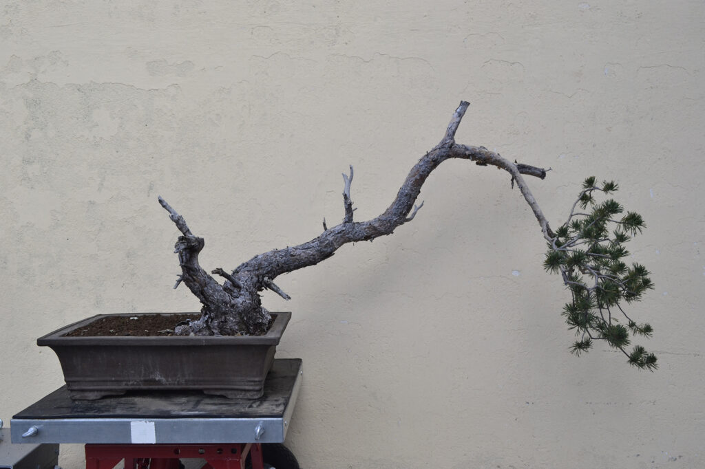 En noviembre de 2017 nos planteamos el modelar este ejemplar de pino que, como se puede apreciar, era un material de escaso valor, puesto que, salvo el potente tachiagari con un jin muy bonito y una buena conicidad, el prebonsái era un palitroque con el verde muy alejado del tronco.