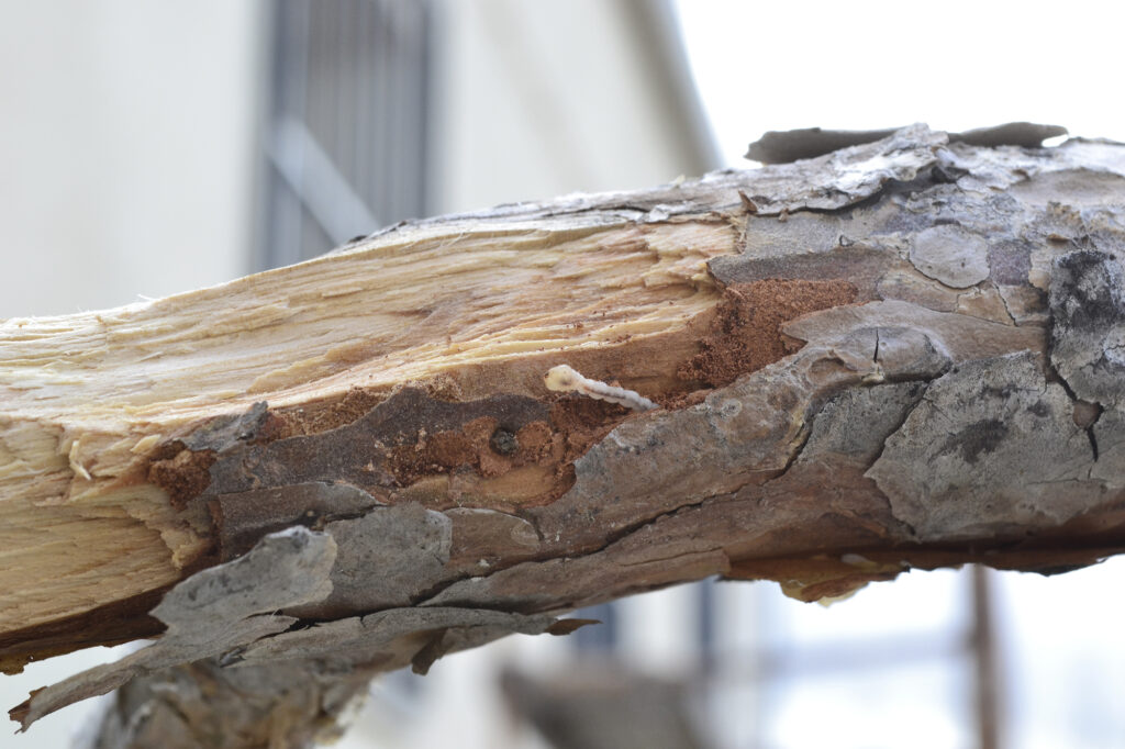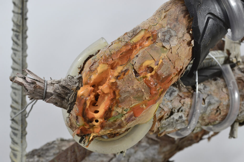 Si nos fijamos en la foto superior, podremos apreciar que se ha aplicado selladora Top Jin (de color naranja), en las grietas producidas en el tronco de manera controlada (al ser longitudinales no conllevan peligro). Esta pasta cicatrizante está creada principalmente para los prunus al llevar un bactericida para evitar infecciones, sin embargo, al ser muy fluida, es ideal para las roturas de ramas y troncos, pues penetra muy bien entre las fisuras proporcionando una protección casi milagrosa.