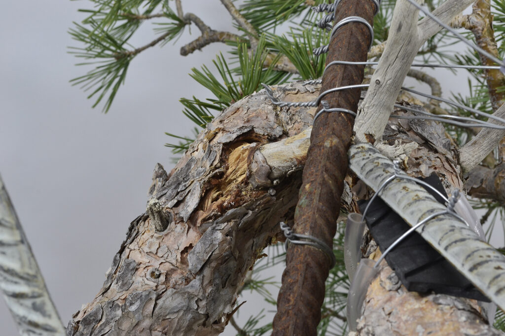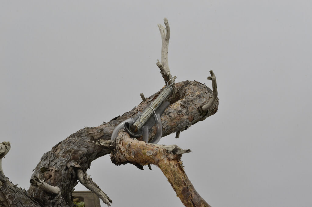 Mostramos esta vista puesto que en este siguiente doblado, el objetivo es acercar el verde al tronco. Si nos fijamos en la parte que se mueve en la horizontal de la imagen, vemos en la parte central un jin con algo de shari formando el vértice de una uve con un ángulo muy abierto. Hay que cerrarlo, peeeeero, contamos con la dificultad añadida de tener madera muerta en ambos tramos y especialmente en el punto de doblado. Ahora sí se pone «dicífil» la cosa.