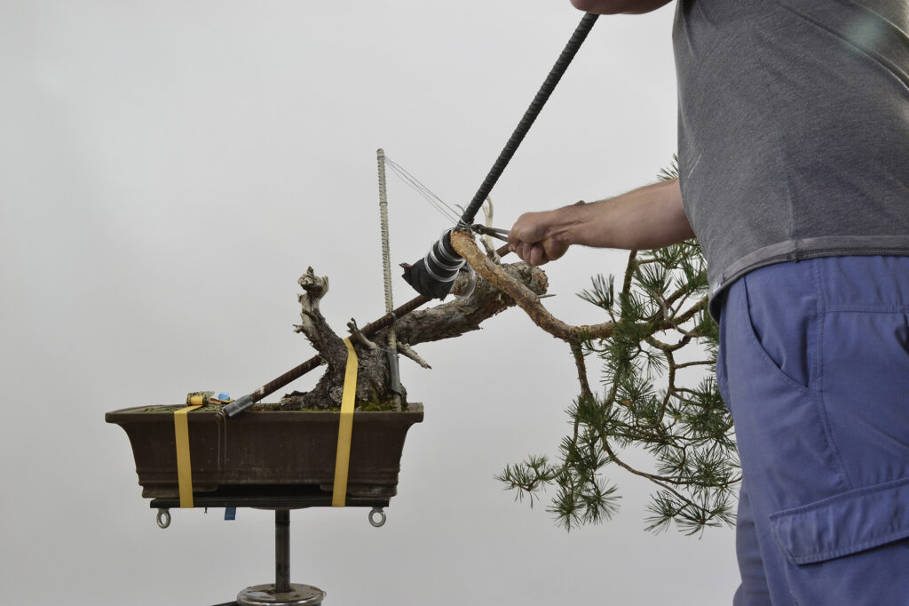 Movemos el tronco con la palanca mientras vamos ajustando el tensor con ayuda de los alicates de jin.