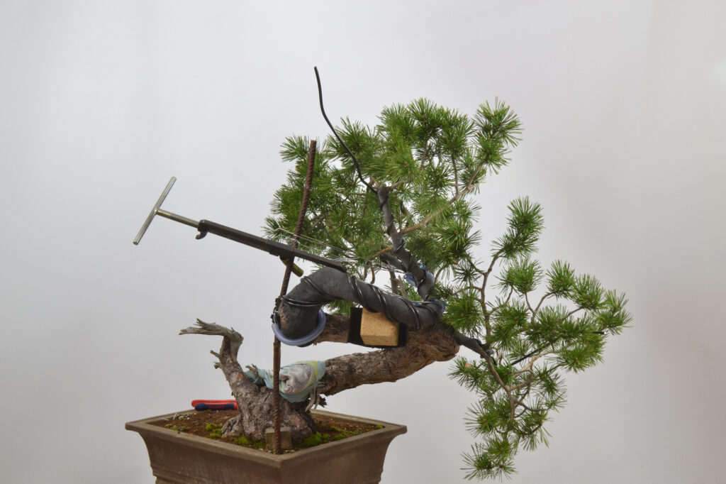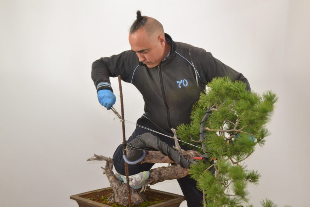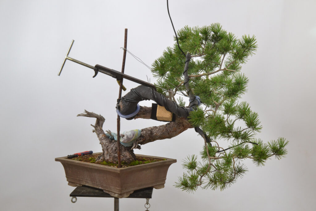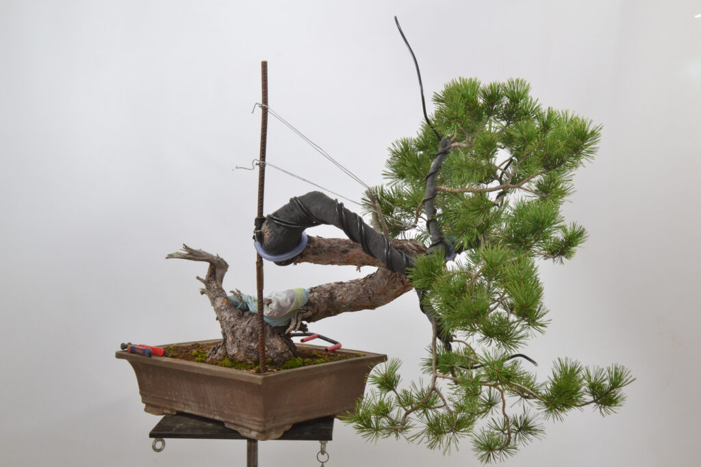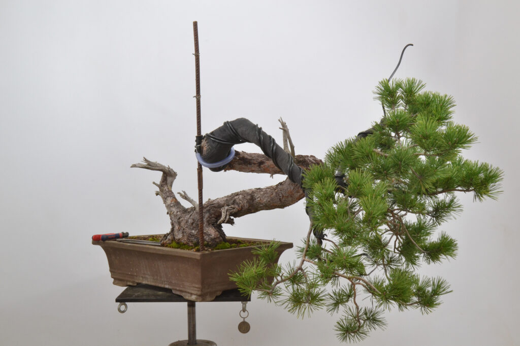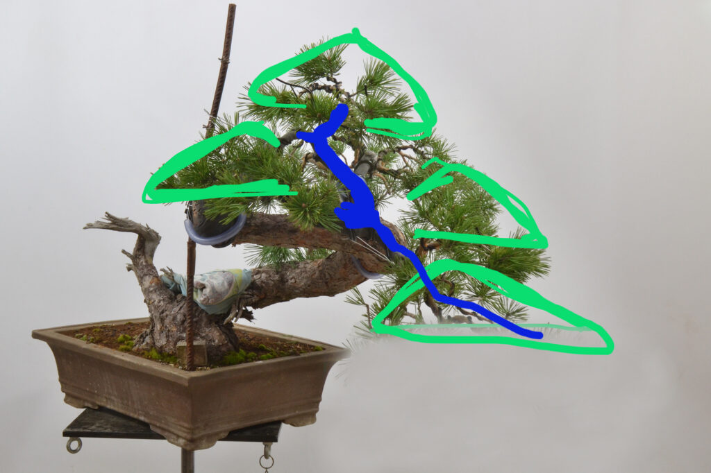 Veréis que hemos borrado parte de la rama principal, que es demasiado voluminosa, pero ahora mismo, prima la salud y el vigor del bonsái, por eso mismo, tampoco hemos quitado acículas salvo en algún punto para pasar el alambre y no dejar las hojas pisadas con él.