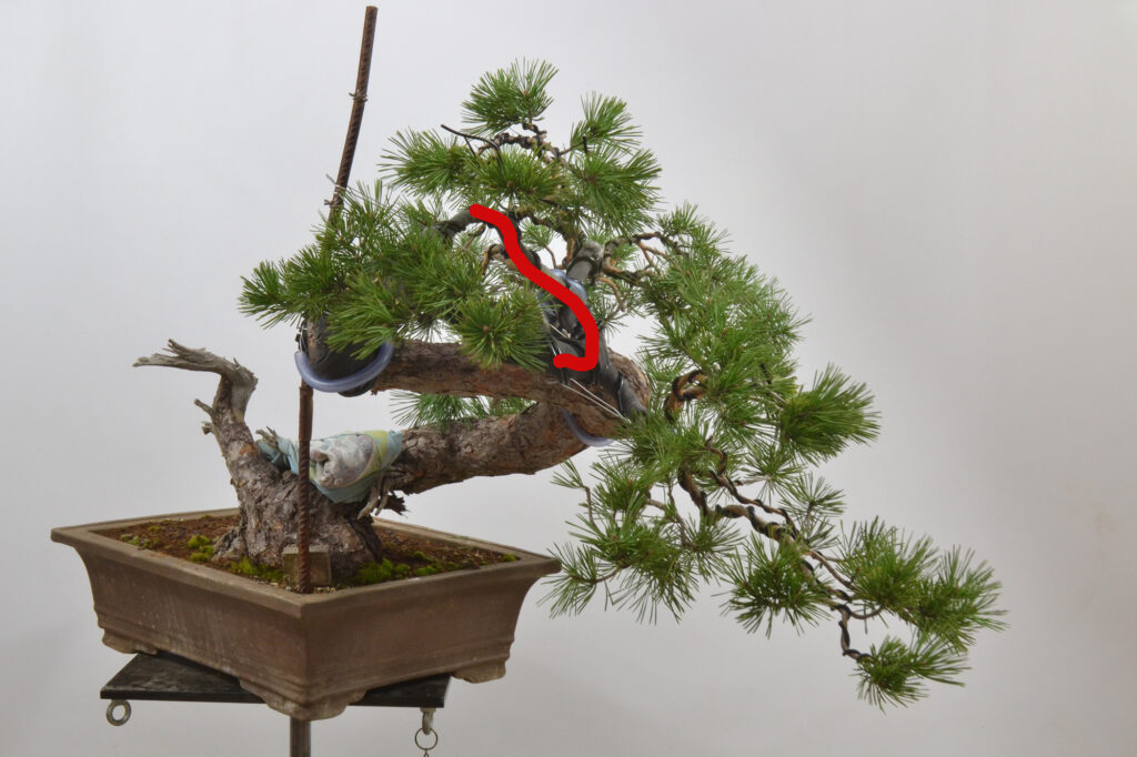 El bonsái tiene un potente tachiagari que se desplaza con fuerza hacia la derecha, vuelve hacia la izquierda, sube hacia la derecha, baja hacia la derecha, sube hacia la izquierda y vuelve de nuevo hacia la derecha. La rama principal sale hacia la derecha y el ápice queda a la derecha del centro del tronco. Todo correcto.